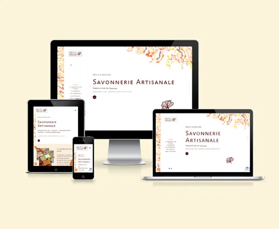 Le site web de Mélite et Papillon a été conçu comme une vitrine en ligne de leur savoir-faire artisanal en matière de savonnerie, avec une partie catalogue présentant les différents savons et shampoings.