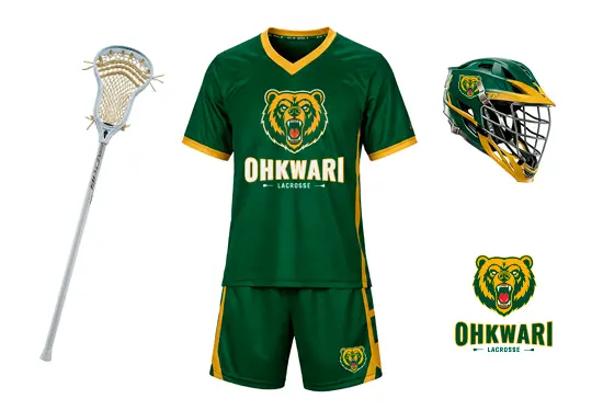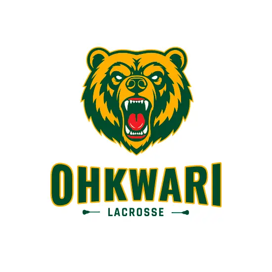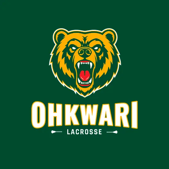 Logo percutant pour l’équipe de lacrosse « Ohkwari ». L’ours en jaune/or sur fond vert foncé symbolise force et compétition. Typographie robuste pour « OHKWARI » et crosses de lacrosse stylisées sur la tagline. L’ensemble crée un emblème percutant et facilement reconnaissable.